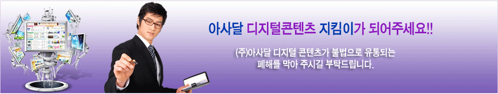 디자인 콘텐츠 제작 및 유통사인 (주)아사달은 디지털 콘텐츠의 불법적인 유통으로 인해 막대한 피해를 입고 있습니다. 아사달의 디자인 콘텐츠를 불법으로 유포하는 상습적 불법파일 유포 네티즌들을 신고하는 네티즌들에게는 신고물에 대한 사실유무 확인 후 소정의 사례품을 드립니다. 적극적인 신고를 통해 많은 시간과 노력을 통해 만들어진 디지털 콘텐츠가 불법으로 유통되는 폐해를 막아 주시길 간곡히 부탁드립니다.